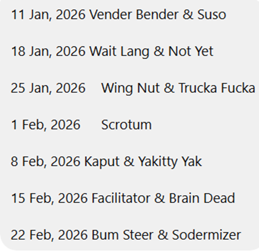 | 2082 | 7/1/2018 | San Martin ... park by the roadside at the top of Propo's driveway at the far end of San Martin village ... usual hash start! | 2 trails ... 5km for short and 8km for long! On-home will be at Premiere Hotel! | Proposition and Never Enough |