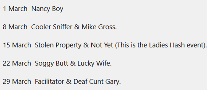 | Number | Date | Location | Remarks | Hare |