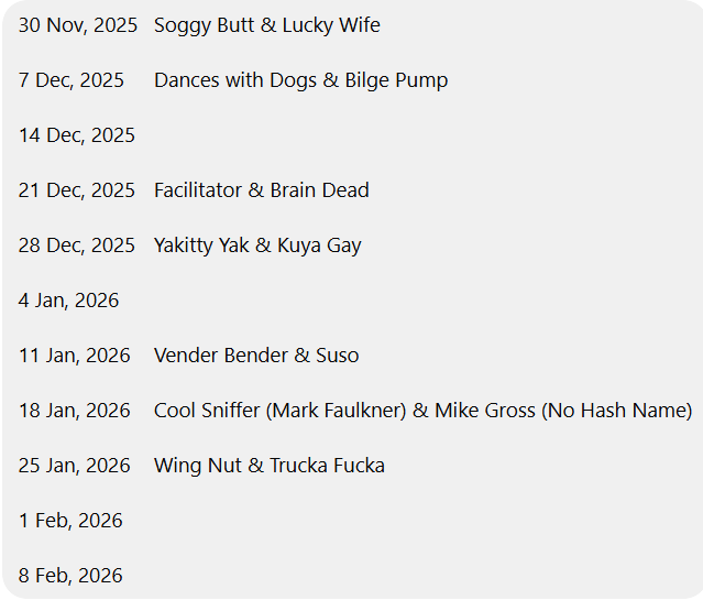 | 2386 | 11/3/2024 | Across BTNW. Right at T. Follow road past rock crushing plant and over steel Baily Bridge. AFTER the wall on the left (200m after bridge) turn left at the sign for Goshen Resort. At the 4 lane road turn left. under the overpass for seating, better to park on the roadside NOT UNDER the overpass to keep the road clear. | About 5k. Not difficult. Hopefully rain proof. Onhome Barbs. Floppy said there should be something worked out for prepared food so check it out! | Soggy Butt and Unlucky Fiance |