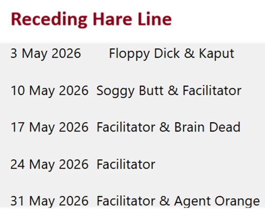 | 2405 | 3/16/2025 | Randys Farm in San Martin. Go over the Bridge to Nowhere (Sacobia River Bridge), and follow the road for 2.3km to the T-Junction. Turn left and follow road 3.5km through the Aeta Village, then turn right on the marked concrete road. Go 100m then turn left into gated land. Take a left at the Y Junction and look for the cars on top of the grassy knoll. Turns will be marked with White Powder. GPS: 15.230972, 120.494528 (15°13'51.5"N 120°29'40.3"E) (6FJV+9RJ). BE AWARE that the turn down the marked road at the top of Randys Place is very steep on the right side and cars should approach as far to the left as possible. The On Home is at Valdez Store on Valdez Street. Journey time from Premiere Hotel to Randys Farm is approx 35 minutes. | San Martin is a naturally hilly area, so all trails involve hills. This Sundays trail(s) are though dry Feet, weather permitting. The Medium Trail is approx 5km. If 5km is too much for you please ask the hares for alternatives. REMINDER: The Jeepney(s) leave the Premiere Hotel promptly at 2pm, so please arrive 15 minutes earlier to avail of this service. The On Home is at Valdez Store on Valdez Street. | Facilitator & Brain Dead |